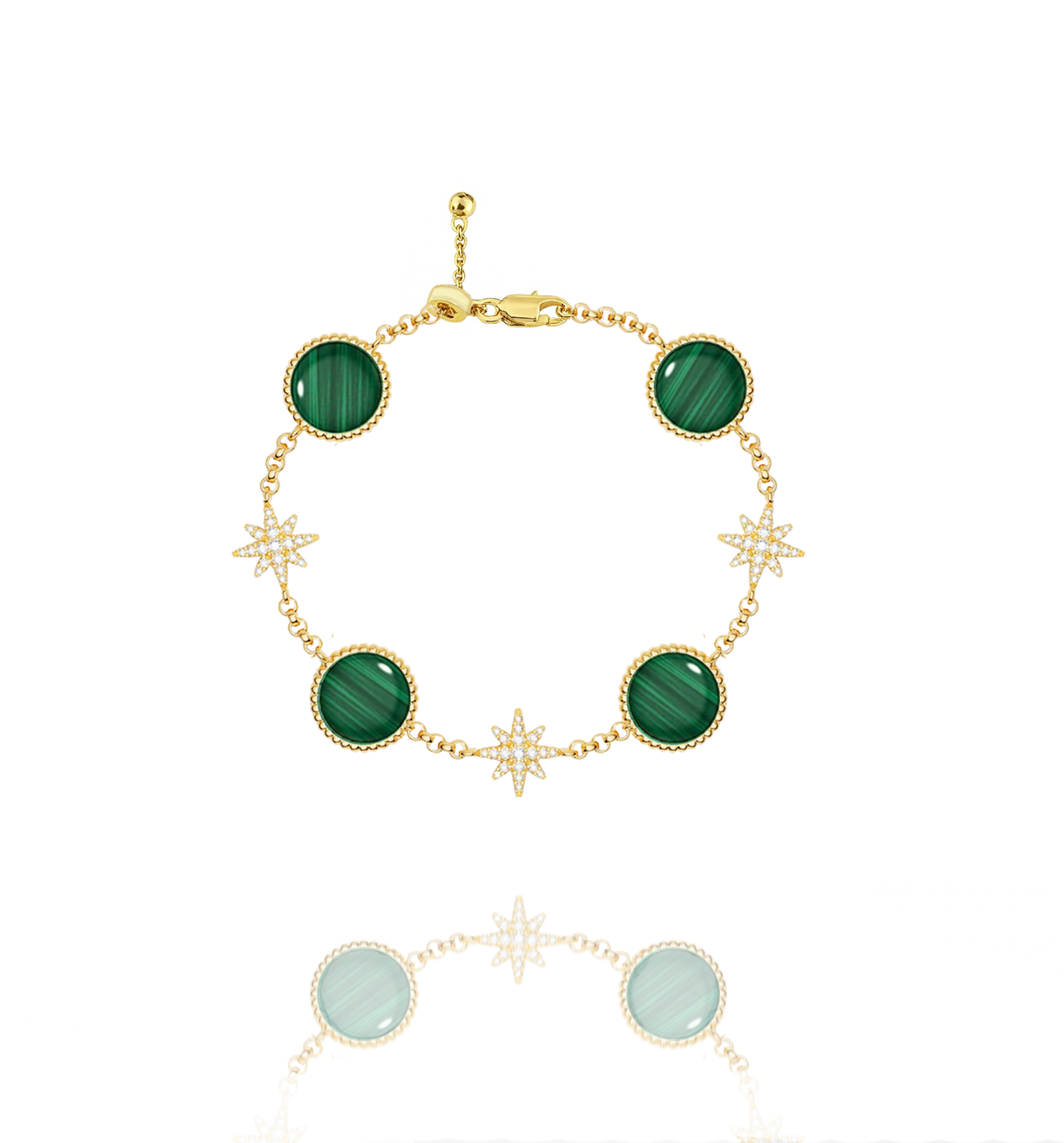 The “Malachite Star Bracelet” ✨ is exquisitely crafted from 925 sterling silver plated with 18K gold 💛. Featuring vibrant natural malachite stones 💎 with unique veining, adorned with sparkling white zircon star charms 🌟, this bracelet radiates luxury, celestial beauty, and timeless elegance.
