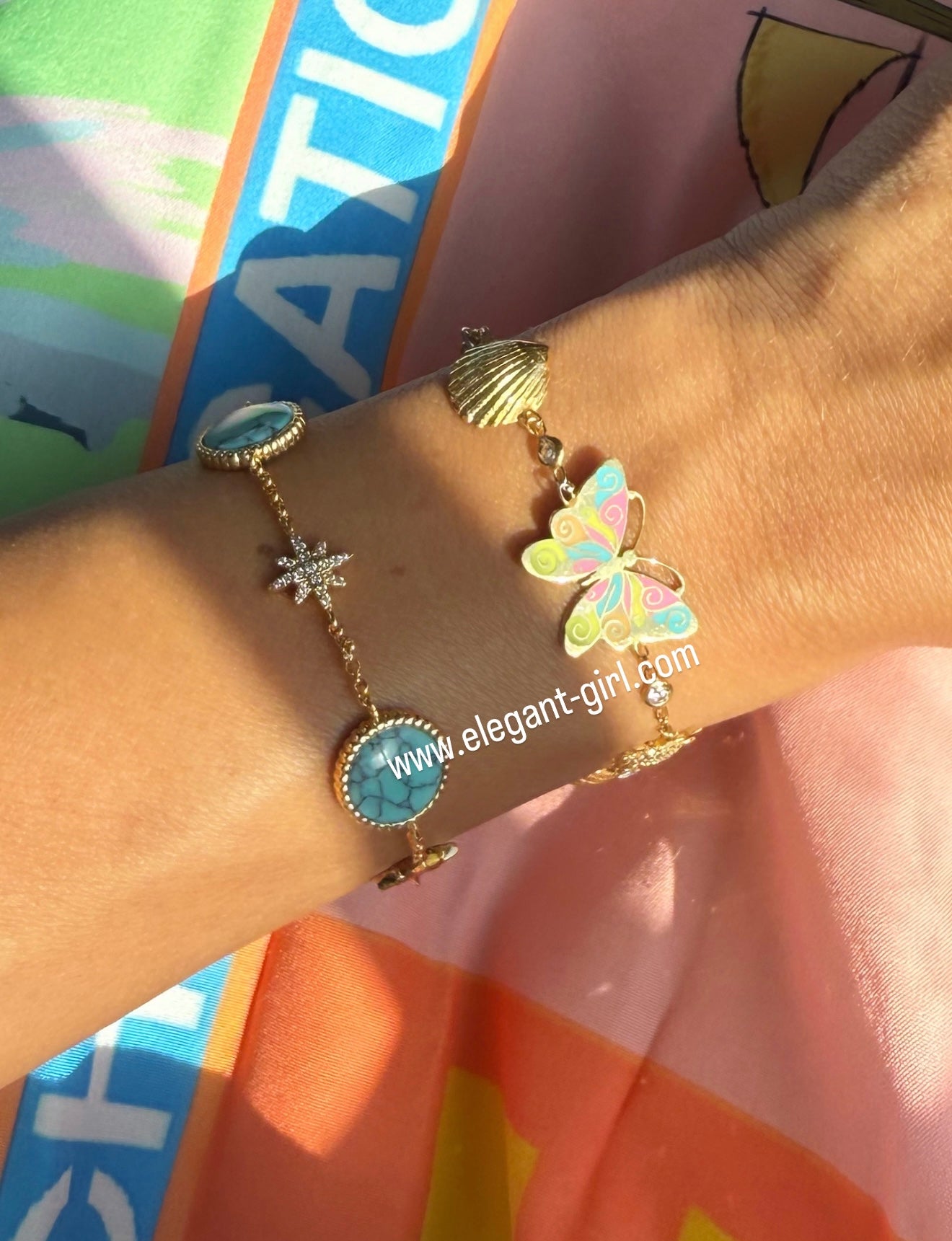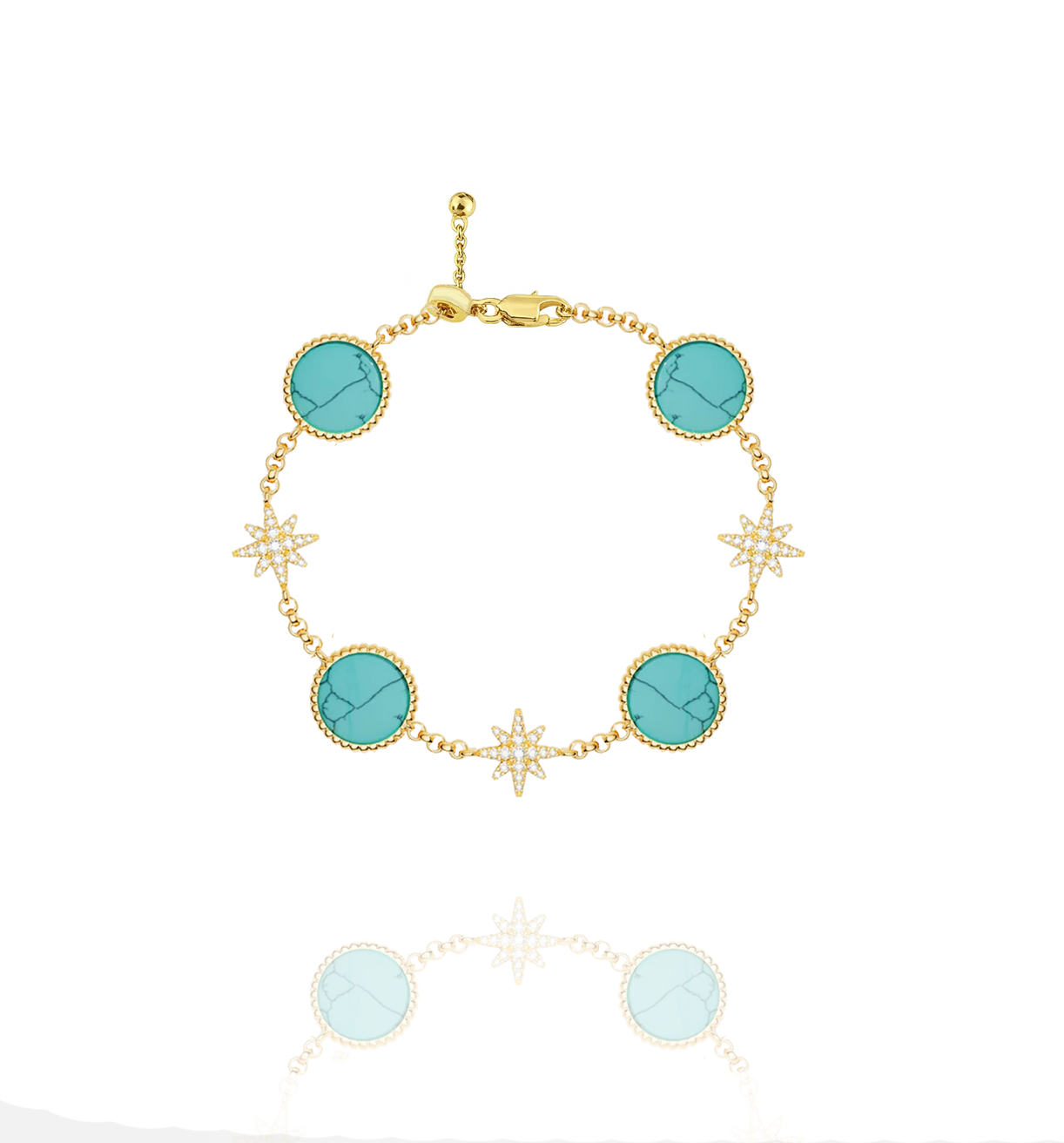 The “Turquoise Star Bracelet” ✨ is exquisitely crafted from 925 sterling silver plated with 18K gold 💛. Featuring vibrant natural turquoise stones 💎 with unique veining, adorned with sparkling white zircon star charms 🌟, this bracelet radiates luxury, celestial beauty, and timeless elegance.