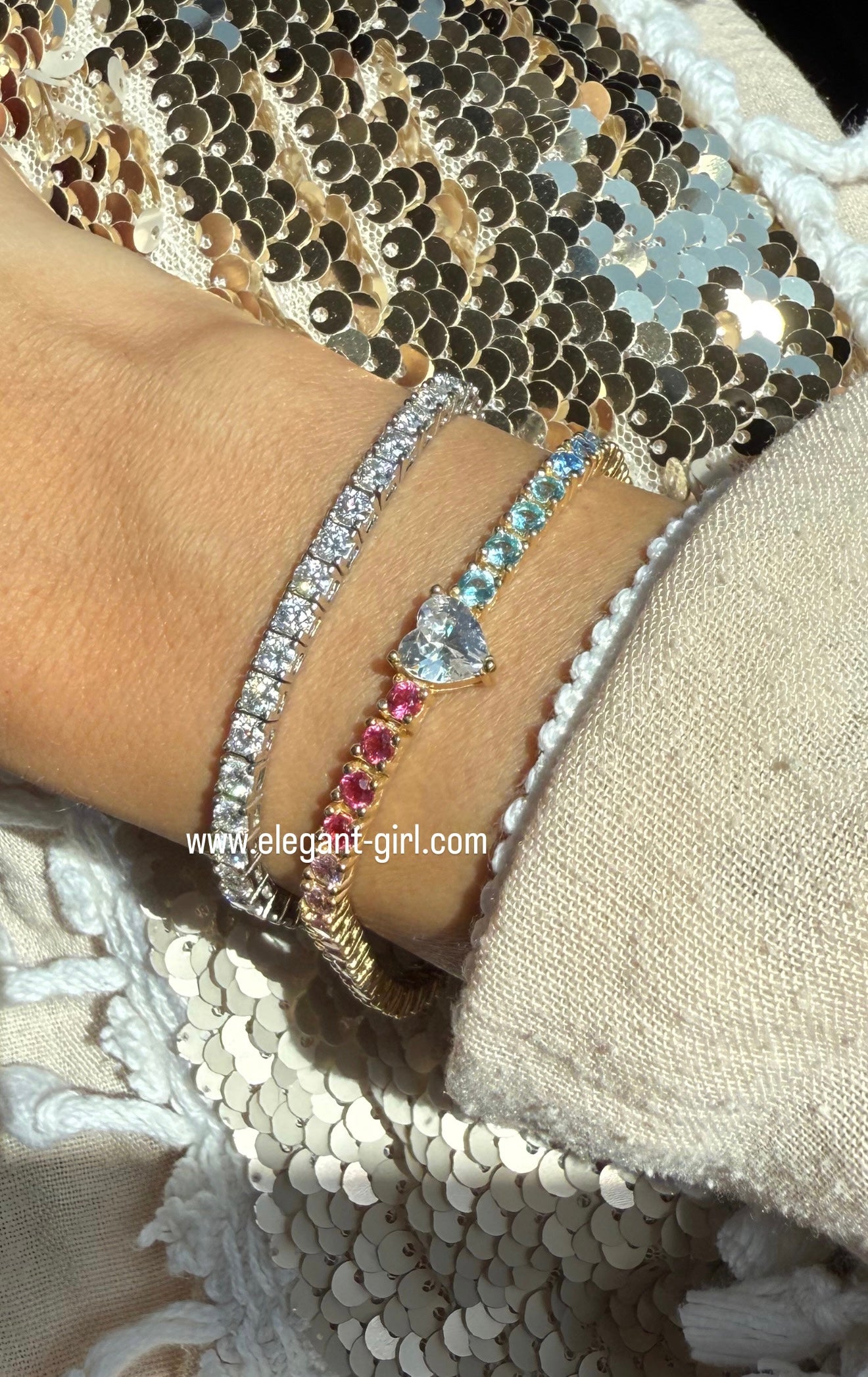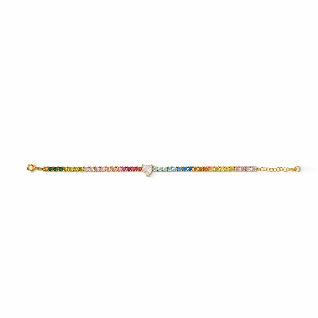 اسوارة تينس فاخرة بتدرج ألماس صناعي ملون مستوحى من ألوان قوس قزح، تتوسطها قطعة مميزة من الألماس الصناعي على شكل قلب تضيف لمسة أنثوية راقية إلى التصميم.