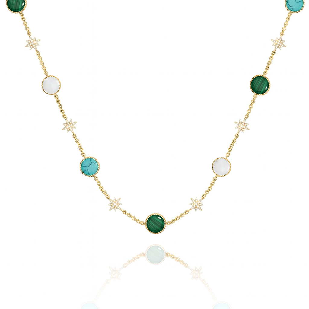 The “Celestial Colors Necklace” is crafted from 925 sterling silver plated with 18 gold, featuring a harmonious blend of natural stones