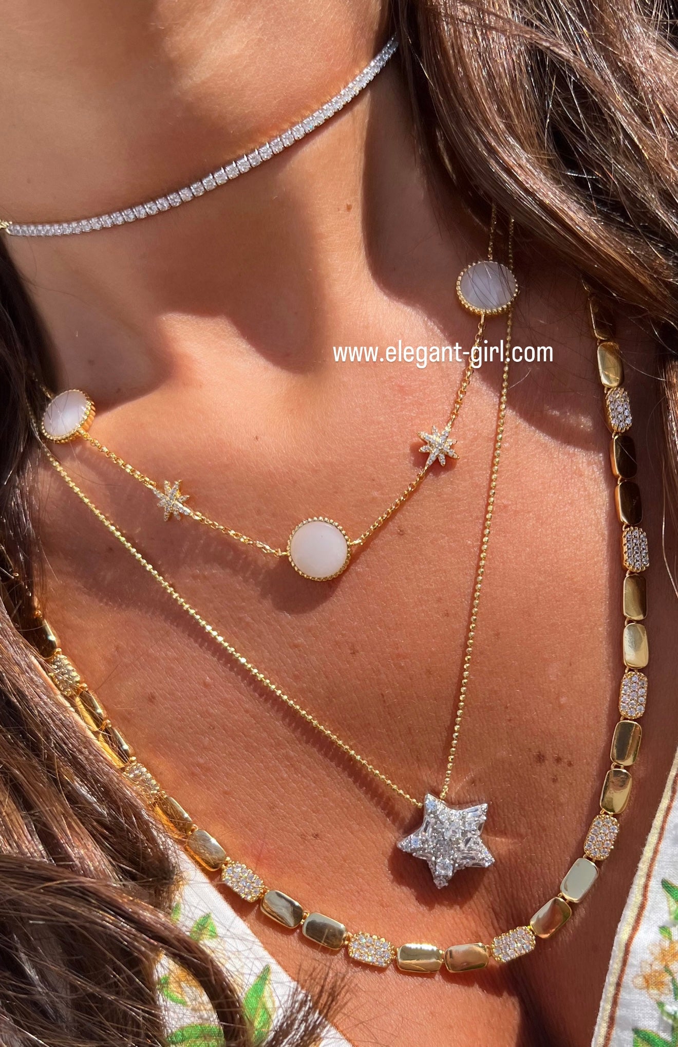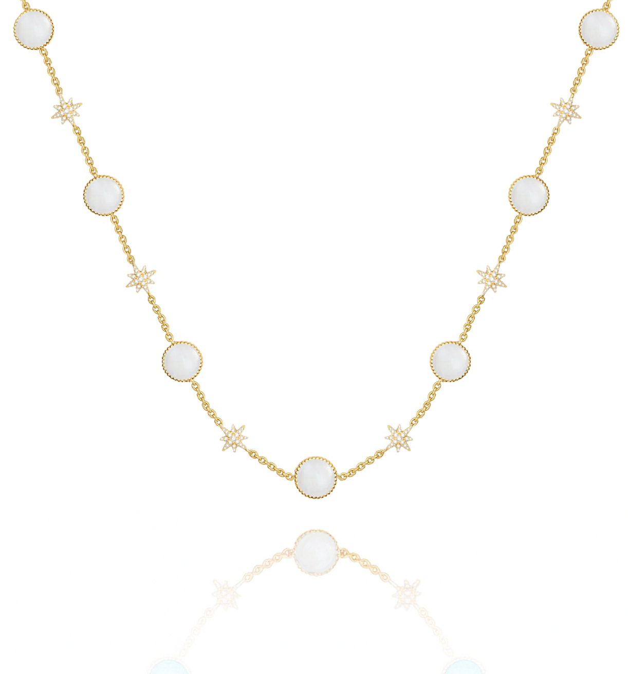 The “Pearly Star Necklace” is crafted from 925 sterling silver plated with 18K gold, featuring luminous white Mother of Pearl stones delicately framed in golden circles. Accented with celestial star charms, this necklace brings together elegance, femininity, and a touch of cosmic magic. Perfect for everyday sophistication or special occasions. ✨🤍