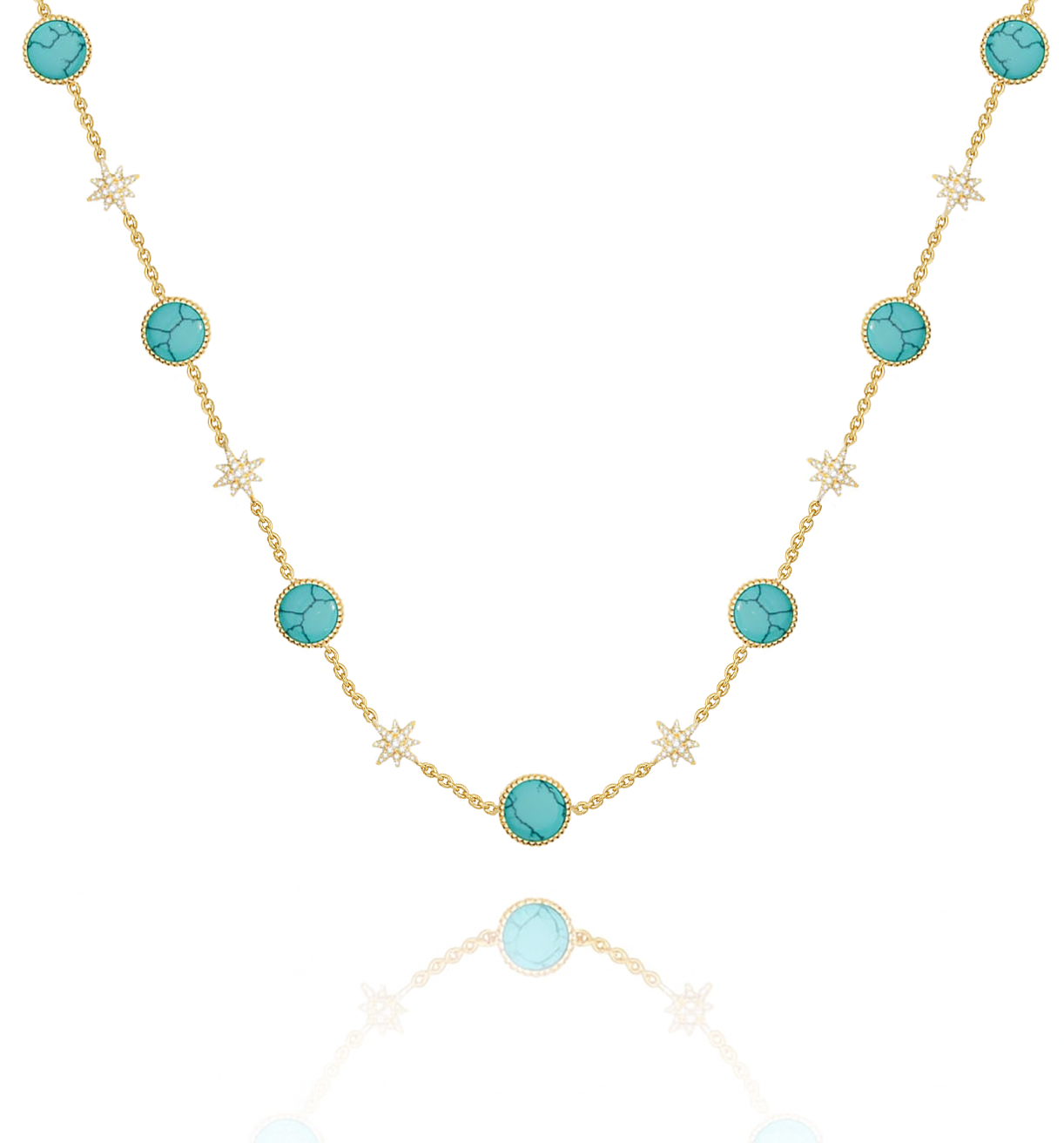 Crafted from 925 sterling silver plated with 18K gold, featuring luminous turquoise  stones delicately framed in golden circles. Accented with celestial star charms, this necklace brings together elegance, femininity, and a touch of cosmic magic. Perfect for everyday sophistication or special occasions. ✨