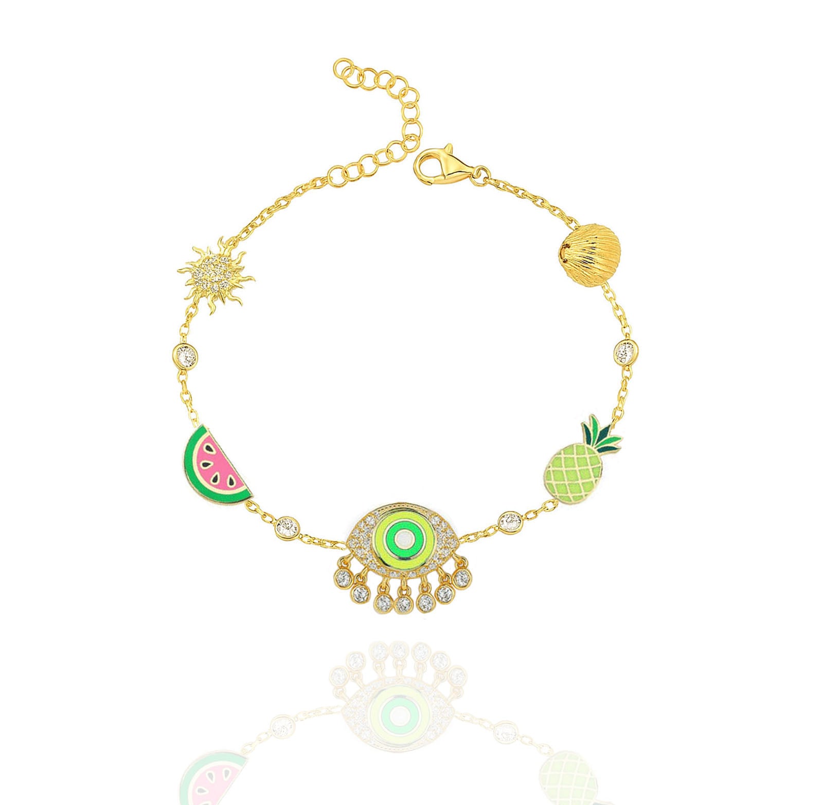Adorned with tropical charms — including the sun, palm tree, watermelon slice, pineapple, golden shell, and a radiant eye — each detail is carefully chosen to reflect joyful island energy. Sparkling diamonds drops add a touch of glam that catches the light with every movement.