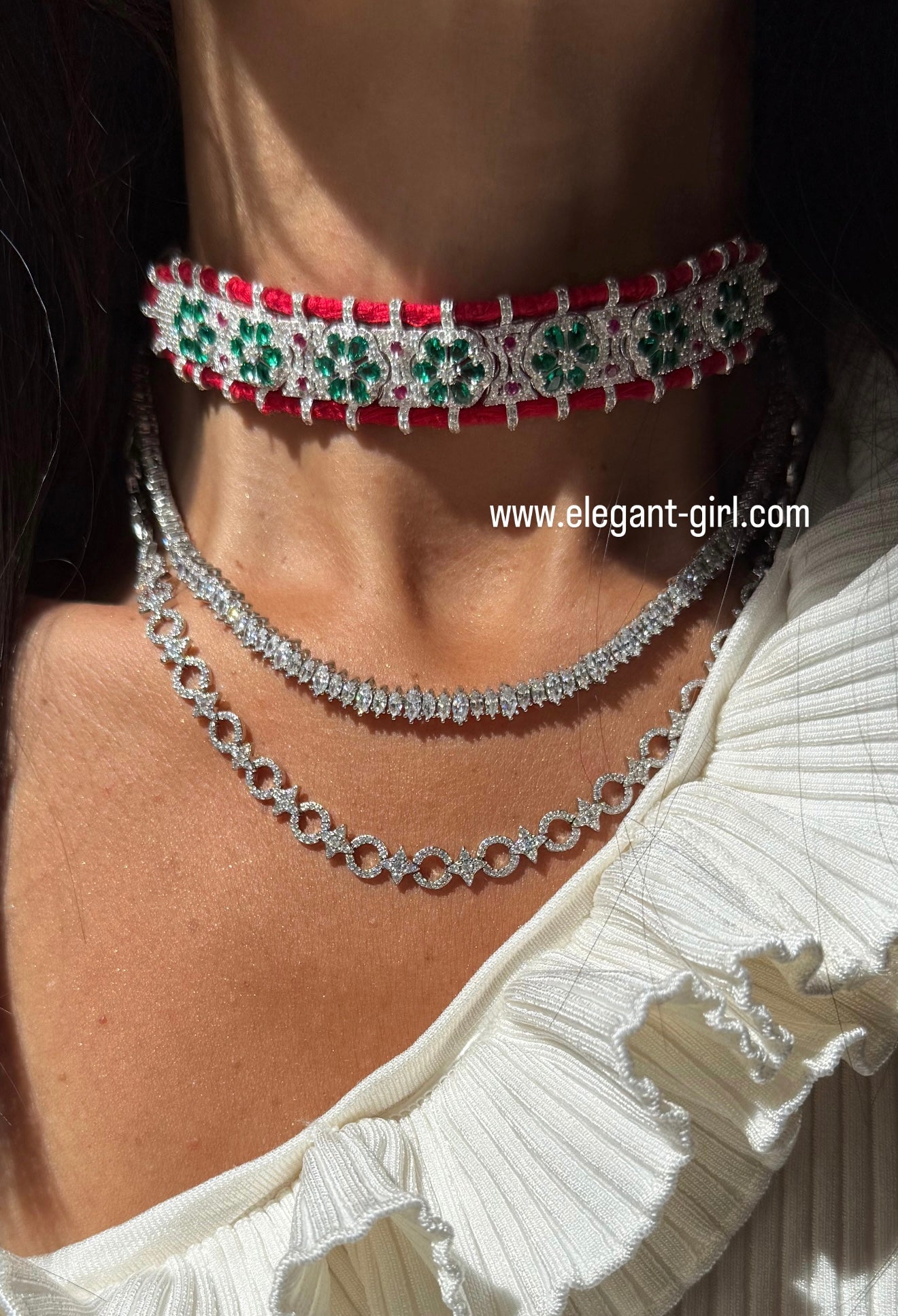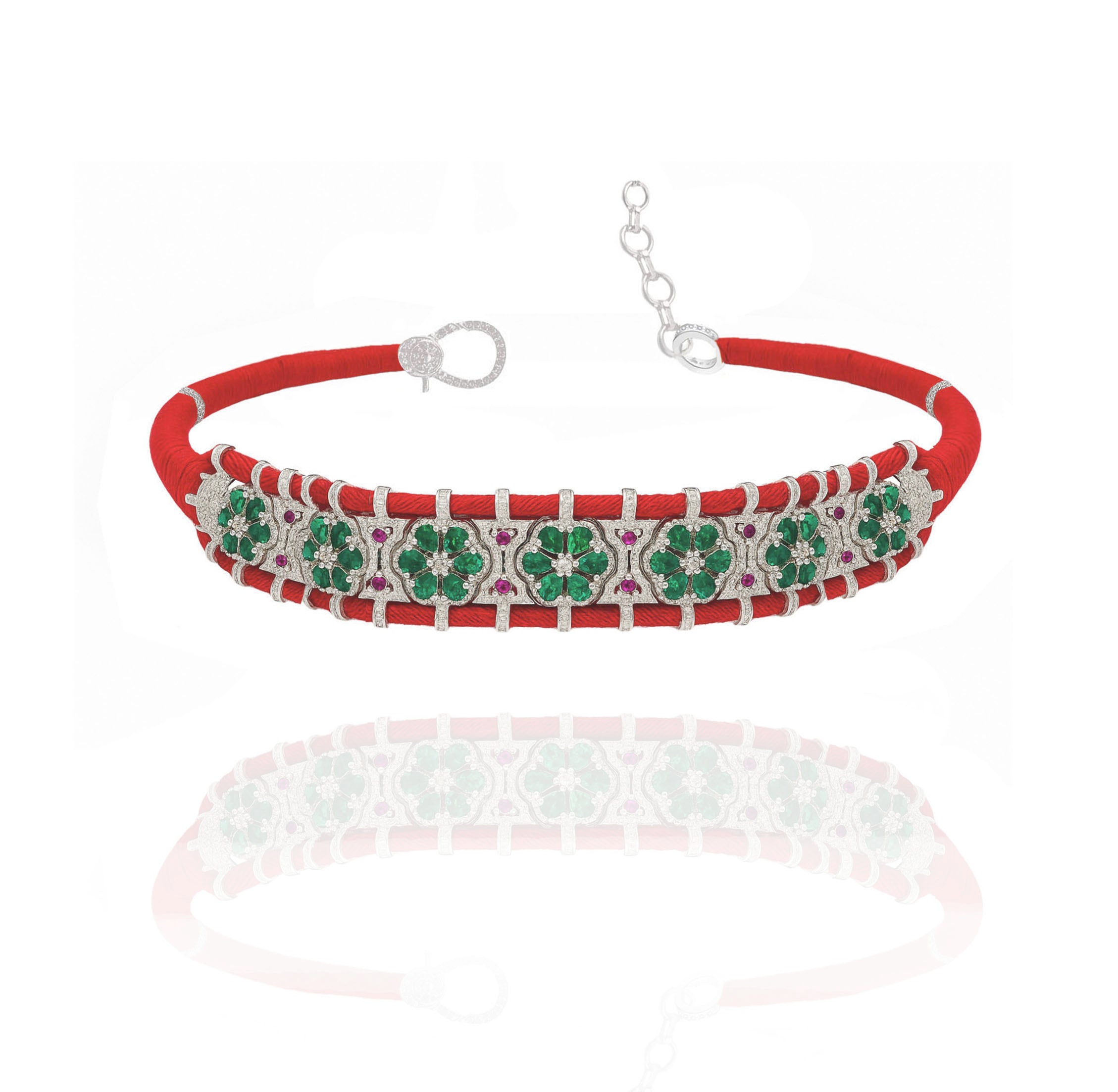 WOVEN GEM RED WITH EMERALD FLOWERS CHOKER